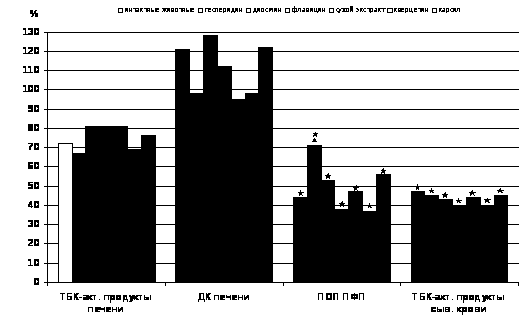 При лечебном применении СЭ наблюдалась более выраженная активация ГП и Г-S-ТР. В то же время у животных, леченных карсилом, отсутствовала активация Г-S-ТР и наблюдалась менее выраженная активация ГП. В результате уже через 14 дней лечения сухим экстрактом наблюдалась полная нормализация содержания продуктов ПОЛ, в то время, как при лечении карсилом нормализация их содержания происходила только к окончанию срока лечения.