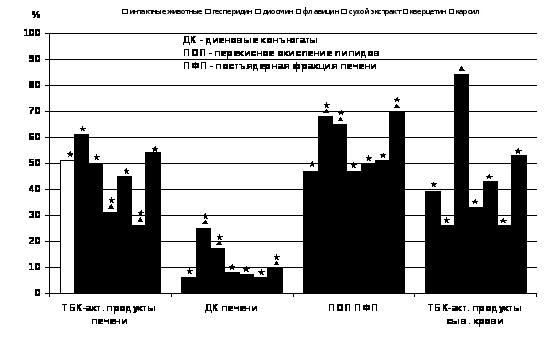 4. На фоне алкогольной интоксикации наибольшая эффективность лечебно-профилактического действия отмечается у флавицина и СЭ, которые практически полностью устраняют признаки поражения печени, а введение гесперидина в наименьшей мере нормализует показатели всех патологических синдромов, наблюдающихся при остром поражении этанолом. Как и при СС1>4>-гепатитогепатозе, кверцетин и карсил превышают действие диосмина на цитолиз и мезенхимальное воспаление и дополнительно на белково-синтетическую функцию печени, но диосмин является более эффективным по воздействию на холестаз и метаболическую функцию печени (углеводный и липидный обмены), чем кверцетин и карсил.
