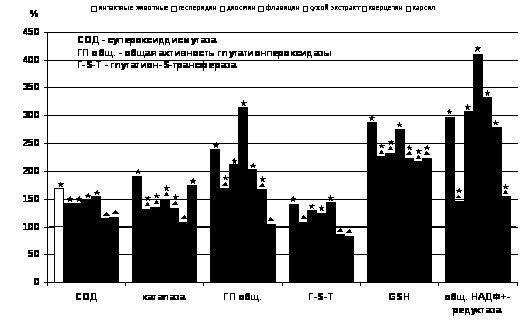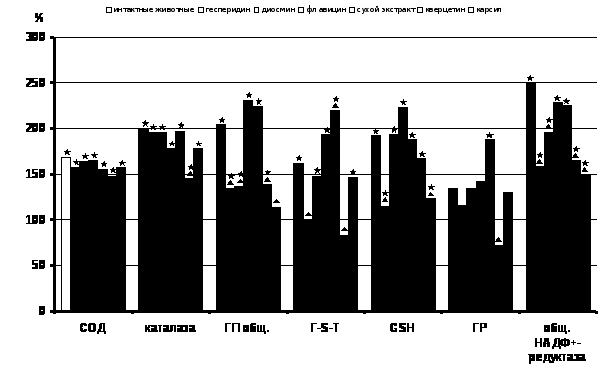 8. При лечебно-профилактическом введении in vivo при острых токсических поражениях печени СС1>4> и этанолом индивидуальные флавоноиды, а также СЭ и карсил отличаются по влиянию на ферментативное звено АОЗ. Флавицин и СЭ способствуют нормализации практически всех показателей АОС, стимулируя активности ферментов, участвующих в регенерации НАДФН>2> (ИЦДГ, Г-6-ФДГ, ГР). Диосмин в меньшей степени влияет на восстановление НАДФ+-редуктазной активности при обеих патологиях. Гесперидин, кверцетин и карсил не оказывают влияния не только на определенные звенья регенерации восстановительных эквивалентов (ИЦДГ, или МДГ, или Г-6-ФДГ, или ГР), но и ферменты, обеспечивающие детоксикацию перекисных продуктов (СОД, каталаза, ГП и Г-S-ТР).