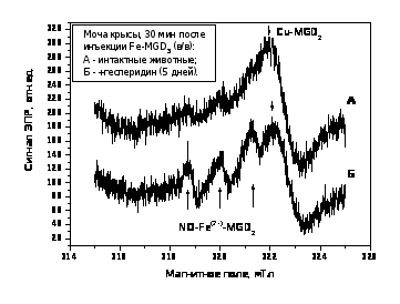Повышение содержания NO выявлено и методом ЭПР в организме животных, получавших гесперидин (100 мг/кг, 5 дней). О повышении уровня NO свидетельствовало увеличение компонентов сигнала парамагнитного аддукта NO-Fe2+-МГД>2> в спектрах ЭПР мочи животных после применения гесперидина по сравнению с таковыми у интактных крыс (рис.3).