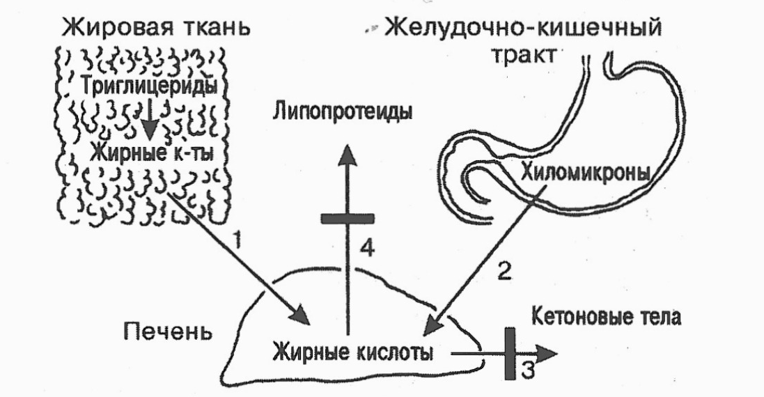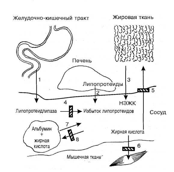 1 - усиленное поступление в кровь хиломикронов и жирных кислот из кишечника; 2 - усиленное поступление в кровь липопротеидов из печени; 3 - усиленное поступление в кровь НЭЖК из жировой ткани; 4 - низкая активность липопротеидлипазы; 5-6 - задержка поступления жирных кислот из крови в жировую ткань и мышцы; 7 - усиленное расщепление комплекса альбумина с жирной кислотой; 8 - гипоальбуминемия и недостаточное образование комплекса альбумина с жирной кислотой.
