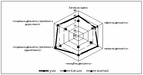 Загальний показник ЯЖПЗ складав (80,4 ± 0,6) % за оцінкою дітей, (74,7 ± 0,8) % за оцінками батьків та (75,6 ± 0,6) % за оцінкою вчителів. Тобто дорослі суттєво нижче оцінювали якість життя дітей (р<0,05). Найбільш високими показники дітей були за шкалами «соціальна діяльність (однолітки)», низькими за шкалами «фізична діяльність» та «емоційна діяльність». Найбільша невідповідність оцінки ЯЖПЗ батьків і дітей була за шкалами – «шкільна діяльність», «емоційна діяльність» та «соціальна діяльність (дорослі)», дітей та вчителів – «соціальна діяльність (однолітки)» та «шкільна діяльність». Ці шкали діти оцінили краще, ніж дорослі.