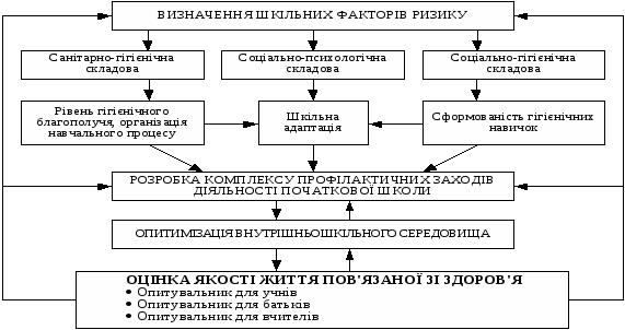 The dissertation is dedicated to sub>stantiation of hygienic approaches to prophylaxis of negative influence of intraschool factors on quality of life and health of junior schoolchildren. The dynamics of health state of schoolchildren of primary school is established in the thesis, as well as the influence of intraschool environment factors at the level of the form. Quality of life health related of junior schoolchildren is studied, as an indicator of influence of school environment. A conceptual model of management for health of pupils of primary school is sub>stantiated, which is based on detailing three levels – strategic, tactic and operative. The algorithm of management for health at the operative level is elaborated. The preventive measures on optimization of effect of guided intraschool factors are introduced and their efficiency is estimated.