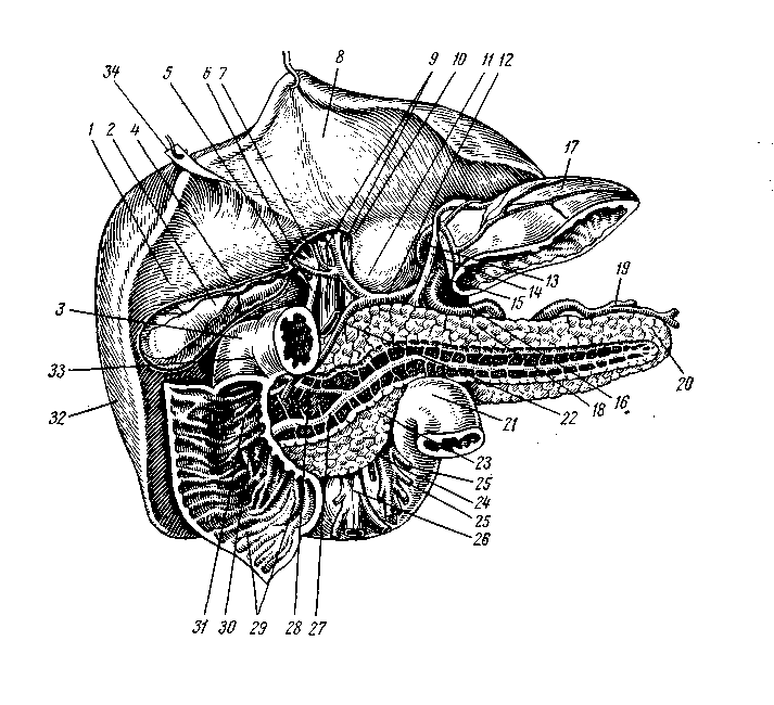 1 — lobus quadratus; 2 — vesica fellea, 3 — duodenum-, 4 — a. cystica; S — ductus cysticus; 6 — ductus choledochus; 7 — ductus hepaticus; 8 — lobus sinister; 9 — porta hepatis; 10 — v. portae; 11 — a. hepatica propria; 12 — a. hepatica communis; 13 — a. gastrica sinistra; 14 — v. coronaria ventriculi; 15 — a. eoeliaca; 16 — aorta; П — fundus ventriculi; IS — corpus pancreatis; 19 — a. lienalis; 20 — cauda pancreatis; 21 — flexura duodeno-jejunalis; 22 — a. gastroduodenalis; 23 — processus uncinatus (pancreas Winslowi); 24 — a. mesenterica superior; 25 — aa. untestinalis; 26 — v. mesenterica superior; 27 — ductus pancreaticus (Wirsungi); 28 — ductus pancreaticus accessorius (Saritorini); 29 — plicae circulares (Kerkringi); 30 — plica longitudinalis duodeni; 31 — papilla accessoria duodeni; 32 — lobus dexter; 33 — pylorus; 24 — lig. teres hepatis