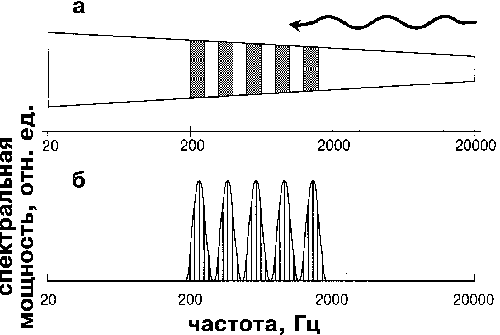 Каждая точка (чувствительная слуховая клетка кортиева органа) реагирует на звук своей частоты, так что вся шкала звуковых частот (от 20 до 20 тыс. Гц) представлена вдоль полоски. Чтобы создать "решетку" из возбужденных и невозбужденных участков (темные и светлые участки), нужно воздействовать звуком, в частотном спектре которого есть пики и провалы на соответствующих частотах.