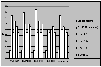 На підставі аналізу, що представлений в таблиці 3.1., можна зробити висновок про те, що тест-культури Candida albicans, як обов`язковий тест-мікроорганізм має мінімальне пригнічення росту. З нашої точки зору це обумовлено філогенетичною стійкістю цієї культури до природних антибіотичних чинників, а також малою швидкістю росту самого мікроорганізму.