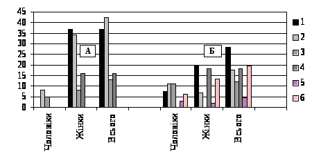 (А) – хворі на гострий ускладнений пієлонефрит; (Б) – хворі на хронічний ускладнений пієлонефрит; 1. Цукровий діабет. 2. Сечокам’яна хвороба. 3. Полікістоз нирок. 4. Нефроптоз. 5. Аномалії розвитку сечової системи. 6. Хронічна хвороба нирок III ступеня.