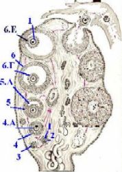 Покоящиеся фолликулы; они называются примордиальными (рис 3, (3)). Это очень мелкие фолликулы, в большом количестве сосредоточенные в основном в субкапсулярной (поверхностной) зоне коркового вещества.