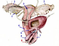 Рис. 1. (1 – яичники, 2 – яйцеводы, 3 – матка, 4 – влагалище, 5 – луковицы преддверия, 6 – клитор, 7 – большие и малые срамные губы, 8 – бартолиниевы железы)