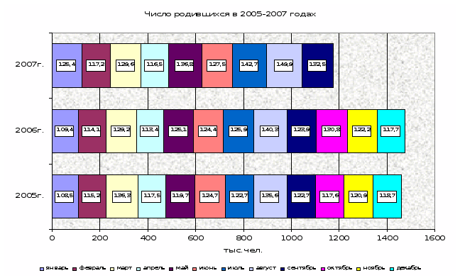 В январе-сентябре 2007 года родились 1178,1 тыс. детей, что на 72,6 тыс. детей (на 6,6%) больше, чем в соответствующем периоде 2006 года. Коэффициент рождаемости (число родившихся на 1000 населения) за девять месяцев 2007 года – самый высокий за последние 15 лет.