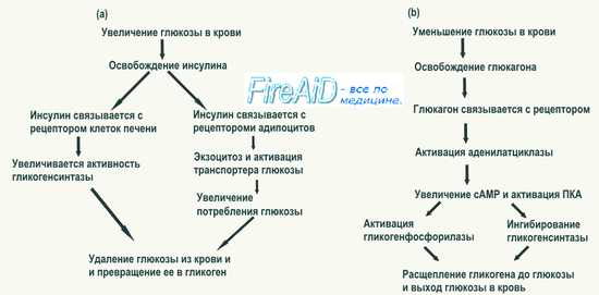 У крові організму людини звичайно міститься близько 5 г глюкози. При середньодобовому споживанні з їжею дорослою людиною, що займаються фізичною працею, 430 г вуглеводів в умовах відносного спокою, тканинами щохвилини споживається близько 0,3 г глюкози. При цьому запасів глюкози в циркулюючої крові достатньо для живлення тканин на 3-5 хв і без її заповнення неминуча гіпоглікемія. Споживання глюкози зростає при фізичному і психоемоційної навантаженнях. Так як періодичний (кілька разів на день) прийом вуглеводів з їжею не забезпечує постійного і рівномірного притоку глюкози з кишечнику в кров, в організмі існують механізми, що заповнюють спад глюкози з крові в кількостях, еквівалентних її споживанню тканинами. При достатньому рівні концентрації глюкози в крові вона частково перетворюється на запасаючу форму - глікоген. При рівні більше 1,8 г в літрі крові відбувається виведення її з організму з сечею. Надлишок глюкози, що надійшла з кишечника в кров ворітної вени, поглинається гепатоцитами. При підвищенні в них концентрації глюкози активуються ферменти вуглеводного обміну печінки, що перетворюють глюкозу в глікоген. У відповідь на підвищення рівня цукру в крові, що протікає через підшлункову залозу, зростає секреторна активність бета-клітин острівців Лангерганса. У кров виділяється більша кількість інсуліну - гормону єдиного, що володіє різким знижувальним концентрацію цукру в крові ефектом. Під впливом інсуліну підвищується проникність для глюкози плазматичних мембран клітин м’язової та жирової тканин. Інсулін активує в печінці і м’язах процеси перетворення глюкози в глікоген, покращує її поглинання і засвоєння скелетними, гладкими і серцевого м’язів. Під впливом інсуліну в клітинах жирової тканини із глюкози синтезуються жири. Одночасно виділяється у великих кількостях інсулін гальмує розпад глікогену печінки і глюконеогенез.