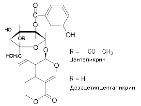 Основными действующими веществами, обусловливающими фармакологическую активность золототысячника, являются горечи - секоиридоидные гликозиды, содержание которых составляет около 0,3% (может достигать 2,4%). Горечи - безазотистые вещества, обладающие - сильно горьким вкусом. Различают чистые горечи (горькие вещества) и ароматические горечи, в состав которых входят эфирные масла. Горечи возбуждают аппетит, усиливают секрецию желудочного: сока и улучшают пищеварение. Они встречаются у представителей многих семейств, особенно горечавковых и сложноцветных. [5]