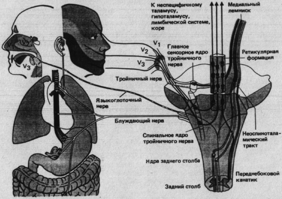 Из-за своего анатомического положения этот участок лемнисковой системы называется вентробазальным ядром (ВБ) или вентробазалъным комплексом. В нем выделяют вентральное постеролатеральное (ВПЛ) и вентральное постеромедиальное (ВПМ) ядра. В ВПЛ находится нейронное представительство туловища и конечностей, а в ВПМ — лица. Главный проводящий путь, который ведет к ВПЛ, - это медиальный лемнисковый тракт, а к ВПМ тройнично-таламический тракт, начинающийся от главного сенсорного ядра тройничного нерва.
