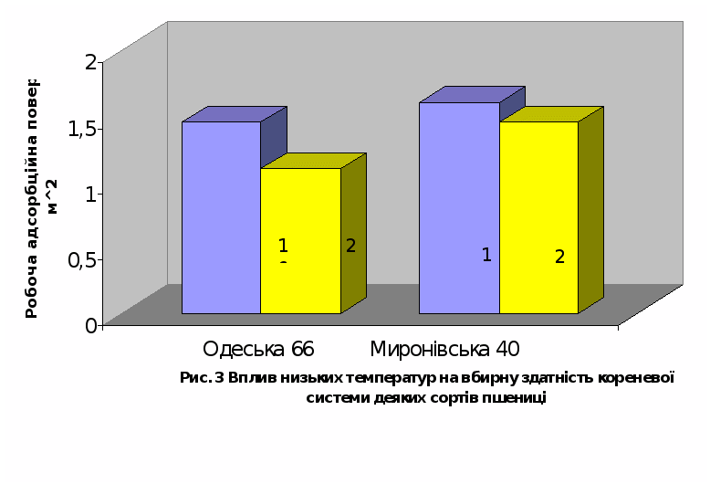 Як видно з таблиць 2 і 3, дія низьких температур негативно впливає на об`єм та вбирну здатність кореневої системи рослин пшениці, причому у більшій мірі у сорту Одеська 66. Так, якщо після проморожування у сорту Миронівська 40 об`єм кореневої системи становив 3,5 см3, то у сорту Одеська 66 всього 1,5 см3 .