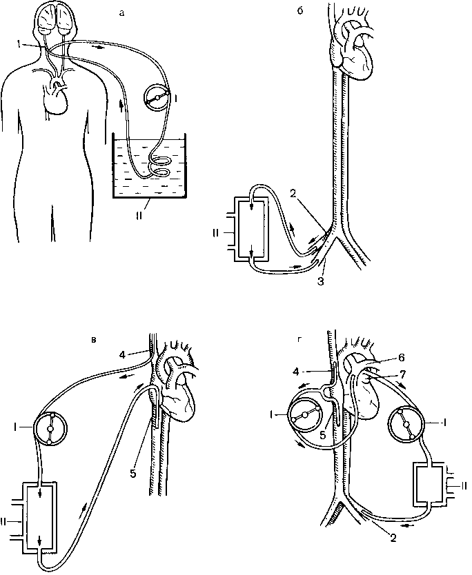 Рис. 3. Схемы экстракорпорального охлаждения крови: артерио-артериального (а), артериовенозного (б), вено-венозного (в), глубокого по методу Дрю (г). I насос, II теплообменник, 1 сонная артерия, 2 бедренная артерия, 3 – большая подкожная вена бедра, 4 верхняя полая вена, 5 нижняя полая вена, 6 легочная артерия, 7 левое предсердие.