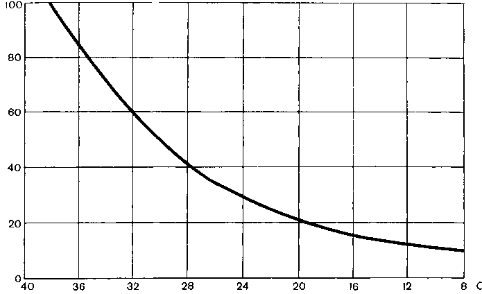 Рис 5 Динамика потребления кислорода организмом при снижении температуры тела. По оси абсцисс – температура в прямой кишке, по оси ординат – общее потребление кислорода.