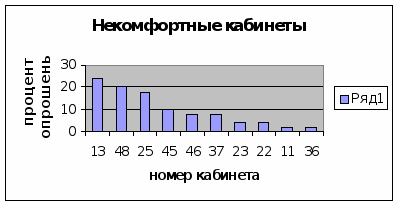 На этих графиках видно, что наиболее комфортным кабинетом является 44-й(электрические лампы, светлые стены, большие окна), а наименее комфортным является 13 и 48 кабинеты, так как в 13 половина окон заклеена бумагой, стены покрашены в голубой цвет, который имеет неприятный для глаз оттенок, в 48 люминесцентные лампы, а на окнах очень часто, особенно в зимнее время, висит затемнение, мешающее поступлению дневного света. Исходя из вышеупомянутых исследований, можно сказать, что на большую роль в приятности кабинета для учащихся является его освещенность, при этом свет должен быть естественным и не раздражающими (люминесцентные лампы), это видно на графике 2: в самых некомфортных кабинетах используются люминесцентные лампы.