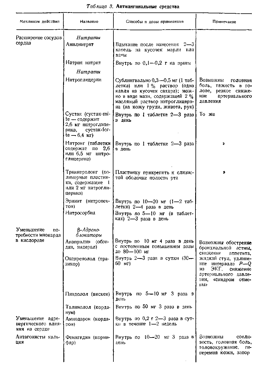 Большую роль играет применение антиангинальных средств, которые обеспечивают соответствие между потребностью в кислороде и доставкой его к миокарду и устраняют, таким образом, ишемию миокарда. Это приводит к купированию или предупреждению приступов стенокардии, а также повышает толерантность к физической нагрузке. В табл. 3 приведены основные группы антиангинальных средств. Представленная группировка в известной мере является условной, так как многие из этих средств характеризуются многогранным действием. Назначать антиангинальные средства необходимо строго индивидуально, с учетом особенностей клинического течения заболевания и возможности развития побочных явлений.
