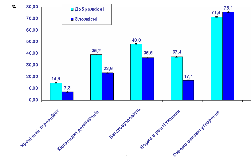Визначити клінічні та ультразвукові фактори ризику наявності злоякісного росту у вогнищевих утвореннях щитоподібної залози на основі системи бальної оцінки.
