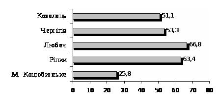 Examinations in Chernihiv region were conducted in three districts: Chernihiv, Ripky, and Kozelets districts (1846 children). The median of urinary iodine excretion for the village Mikhailo-Kotsyubynske was 25.8 mcg/l, which pointed out a high degree of iodine deficiency. In other settlements, the median of urinary iodine excretion was somewhat higher: 51.1 mcg/l in Kozelets, 53.3 mcg/l in Chernihiv, 66.8 mcg/l in Lyubechi, 63.4 mcg/l in Ripky, which suggested a mild or moderate degree of iodine deficiency.