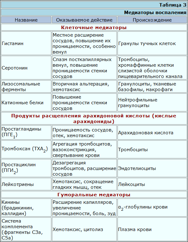 Фрагменты СЗа и С5а, а также трехмолекулярный комплекс С567 вызывают хемотаксис лейкоцитов. Наконец, клетки, нагруженные фрагментами С36, становятся объектом активного фагоцитоза. Характеристика основных медиаторов воспаления приведена в табл. 3.