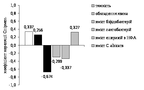 У І групі ступінь дисбіозу корелює з наявністю нальоту на язику r>s>=0,256 (р0,05), з деякими представниками мікрофлори: біфідобактеріями r>s>=-0,674 (р0,01), ЛБ r>s>=-0,299 (р0,05), Candida albicans r>s>=0,327 (р0,05), ешерихіями з НФА r>s>=-0,337 (р0,01) (рис.1).