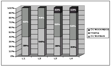 При оцінці розподілу стану МЩКТ по хребцях L1, L2, L3, L4 у обстежених з природнім перебігом післяопераційного періоду виявлено значне зростання частоти остеопенічного синдрому через шість місяців після операції (рис. 1), тоді як у жінок, що приймали гормонотерапію частота остеопенічного синдрому достовірно не змінювалась.