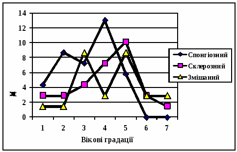 Звертає увагу, що в групі наших пацієнтів у чоловіків після 45 років достовірно більше (р<0,02) було випадків захворювання на КО, ніж до 45 років (табл.1). При розгляді вікової різниці розвитку приглухуватості внаслідок кохлеарного отосклероза відмічається тенденція до більш частого захворювання в групі пацієнтів старше 45 років серед чоловіків. Визначається тенденція, що жінок в групі до 45 років більше, ніж чоловіків. Цей факт можна пояснити тим, що на цей період припадає дітородний вік жінок, а вагітність прискорює розвиток отосклерозу. Аналогічна тенденція до розподілу хворих за віком спостерігається в групі пацієнтів із ЗФО.