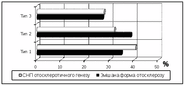 Серед осіб із СНП отосклеротичного генезу і змішаною формою отосклерозу частота випадків з мінімальною і помірною формою важкості приблизно однакова – 20,3% і 21,2% при мінімальній формі ураження; 69,6% і 78,8% при помірній формі. Важка форма ураження характерна для кохлеарної форми отосклерозу і не спостерігалась у хворих із змішаною формою отосклероза.