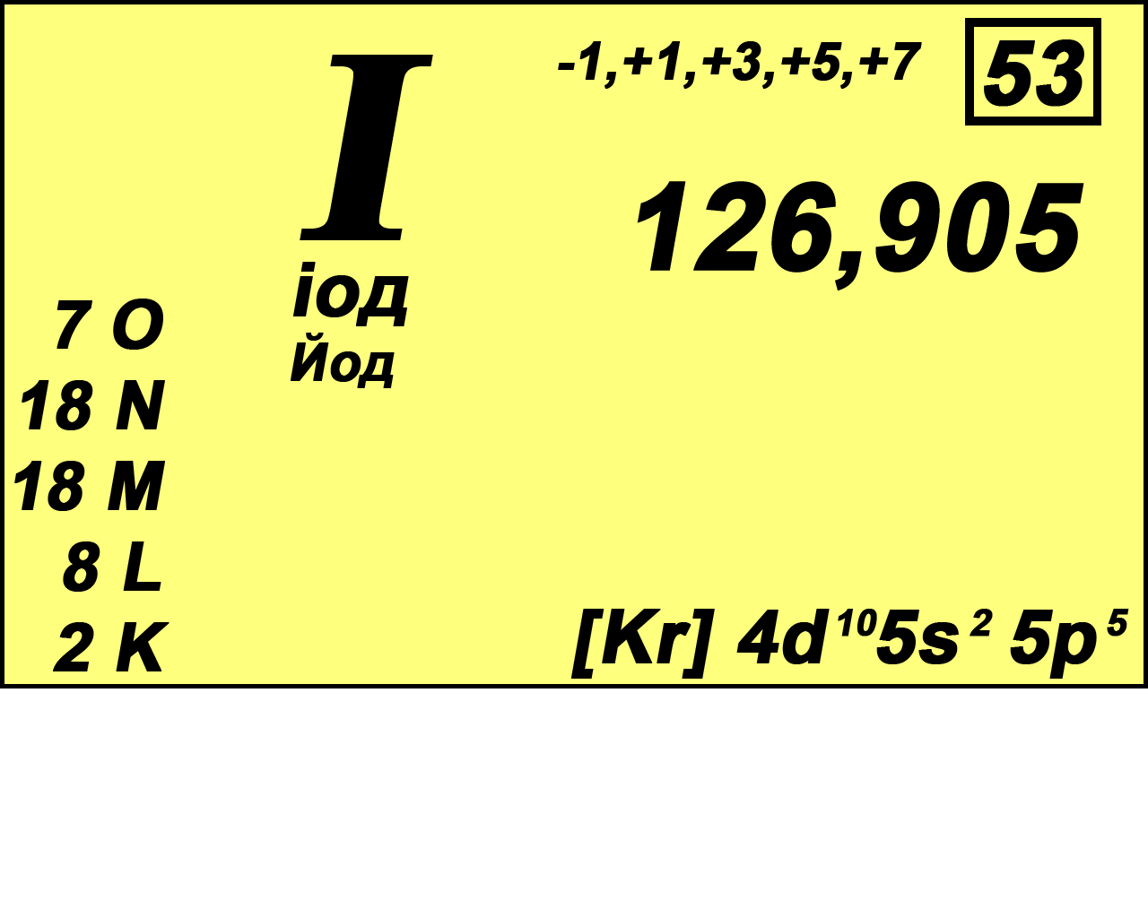 Йод – хімічний елемент VII групи періодичної системи Менделєєва. Атомний номер - 53. Відносна атомна маса 126,9045 (рис. 1). Галоген. З наявних у природі галогенів – найважчий, якщо, звичайно, не вважати радіоактивний короткоживучий астат. Практично весь природний Йод складається з атомів одного – єдиного ізотопу з масовим числом I127, його вміст у земній корі 4 * 10-5 % по масі. Радіоактивний Йод I125 утвориться в ході природних радіоактивних перетворень. Зі штучних ізотопів Йоду найважливіші – Йод I131 і Йод I133. їх в основному використовують у медицині.