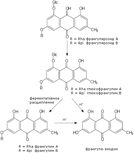 Они обладают раздражающими и рвотными свойствами. Вместе с тем эти соединения являются лабильными и способны к автоокислению даже кислородом воздуха. Поэтому кору крушины применяют после хранения в течение 1 года или процесс окисления ускоряют нагреванием при 110°С в течение 1 часа. Сначала франгулярозиды превращаются в гюкофрангулины А и В. Дале под влиянием ферментов от глюкофрангулинов отщепляется молекула глюкозы, таким образом биозиды превращаются в монозиды франгулин А и франгулин В. В кислой среде они гидролизируются с высвобождением франгула-эмодина и рамнозы (франгулин А) или апиозы (франгулин В). Ведь в коре крушины, используемой в медицине, могут одновременно содержаться глюкофрангулины, франгулины и франгула-эмодин.