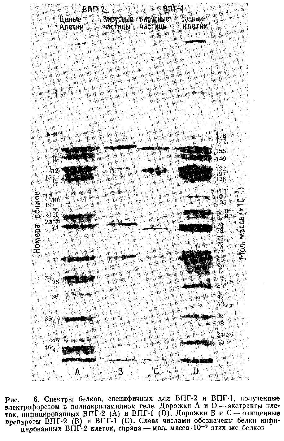 В большинстве случаев проводится электрофорез в пластинах полиакриламидного геля в присутствии ДДС-Na, как было описано впервые Даймэком и Ватсоном. Модификация данного метода изложена в работе. Гели окрашивают кумасси бриллиантовым синим, а для авторадиографического анализа экспонируют с рентгеновской пленкой. На рис. 6 представлены спектры структурных полипептидов ВПГ-1 и ВПГ-2, полученные гель-электрофорезом. Другие характеристики этих полипептидов приведены в табл. 1.
