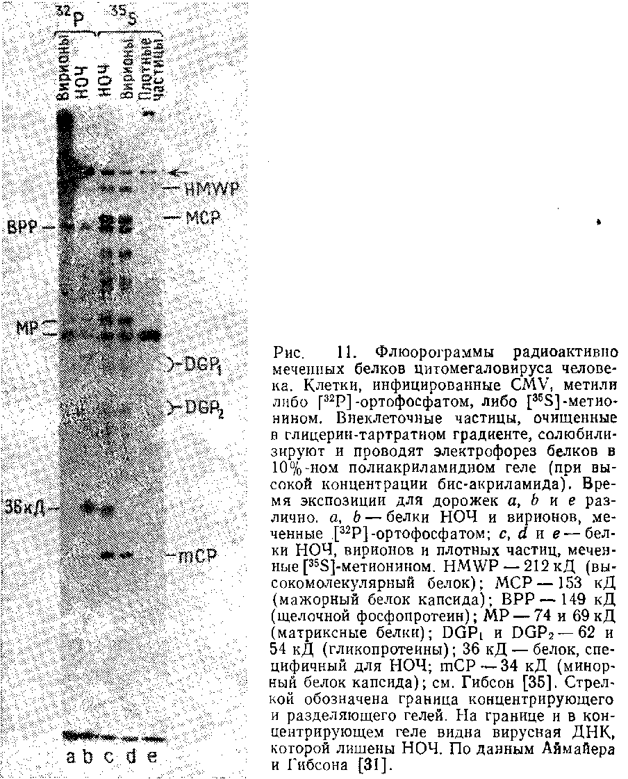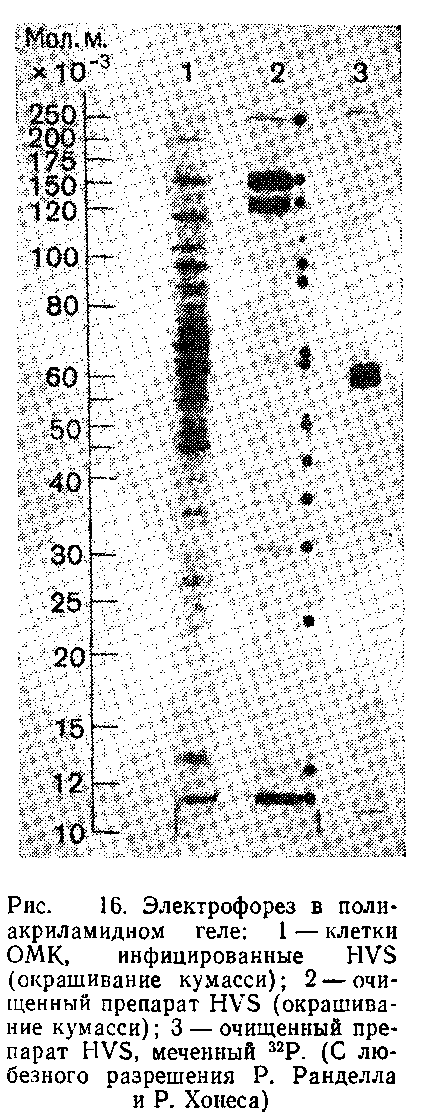 В результате первого градиентного центрифугирования получают осадок, содержащий большое количество вируса. Осадок можно ресуспендировать и дополнительно очистить вторым градиентным центрифугированием. Фракции очищенного вируса могут быть использованы для определения концентрации белка, количества физических частиц и инфекционного титра. Для исследования вирусных частиц электрофорезом в полиакриламидном геле вирус разрушают, как описано выше для ВПГ. Спектр структурных полипептидов HVS штамма 11 показан на рис. 16.