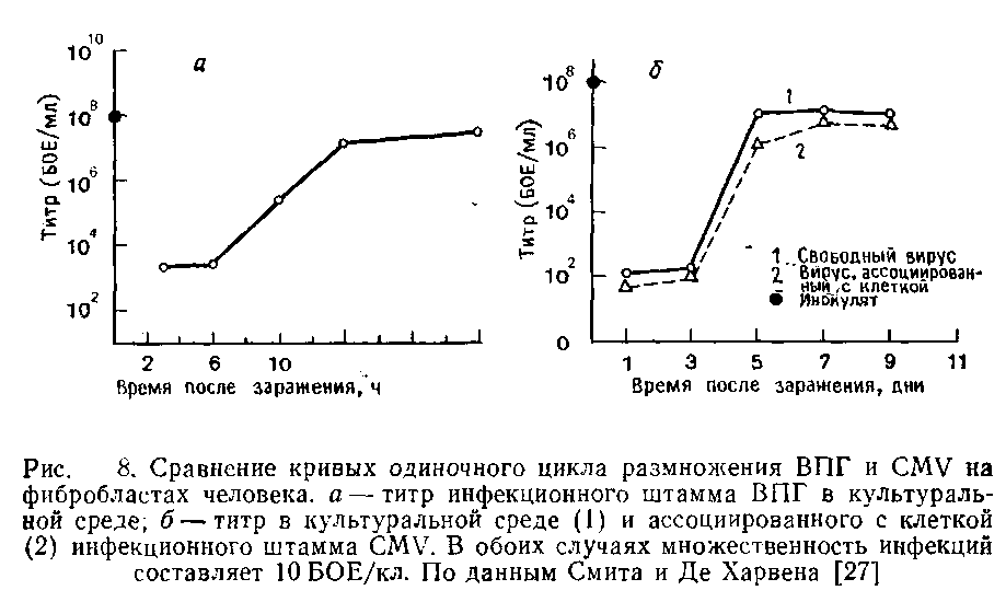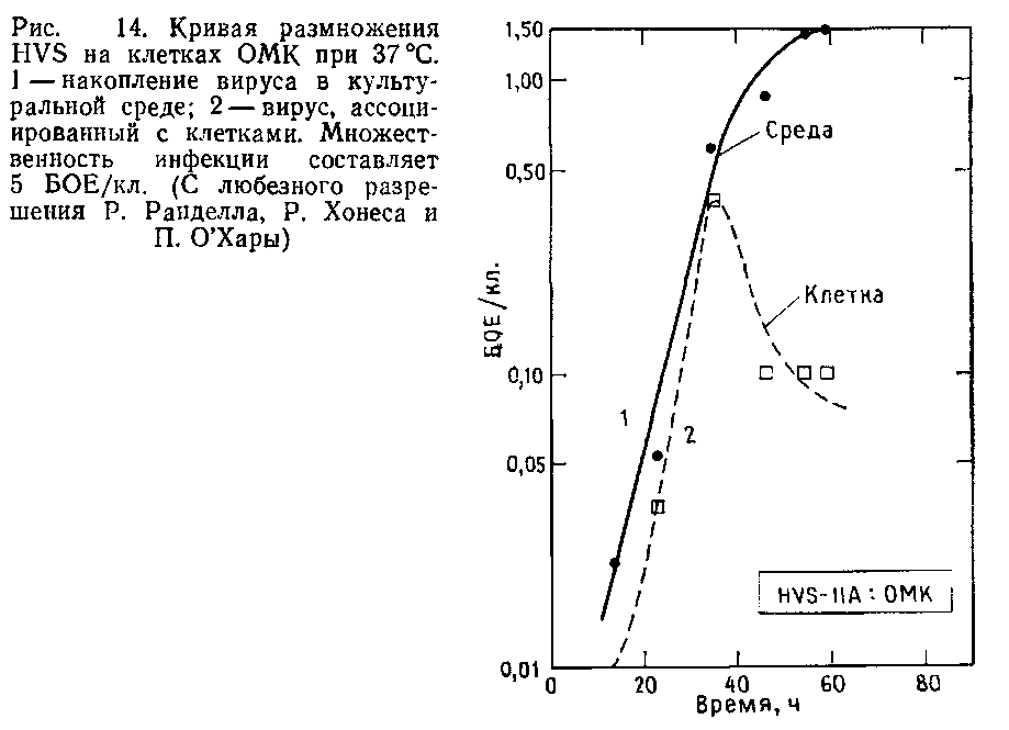 Обычно для получения кривых роста в культуры вносят вирус с высокой множественностью инфекции, а затем через короткие промежутки времени собирают вирус. Таким образом, получают кривую роста HVS. Однако интерпретировать полученные результаты следует с осторожностью. Рэн-делл и Хонес показали, что в этих условиях во многих клетках задерживается инициация вирусной репликации. Если это действительно так, то цикл размножения HVS в одной инфицированной клетке может завершиться за 18 ч.