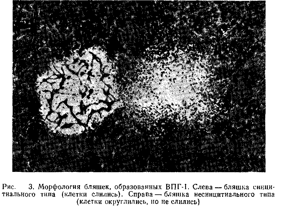 Вирусные бляшки можно обнаружить и невооруженным глазом, однако для их подсчета следует воспользоваться стереомикроскопом. Бляшки вирусов простого герпеса различаются по морфологии. Некоторые штаммы вызывают слияние клеток, что приводит к образованию больших синцитиальных бляшек, в то время как другие штаммы вызывают округление клеток. На рис. 3 для сравнения показана морфология описанных выше бляшек. Однако во многих случаях продолжительная инкубация клеток с вирусом, вызывающим образование синцитиев, приводит к изменению картины ЦПД. Бляшки при этом приобретают несинцитиальный характер.