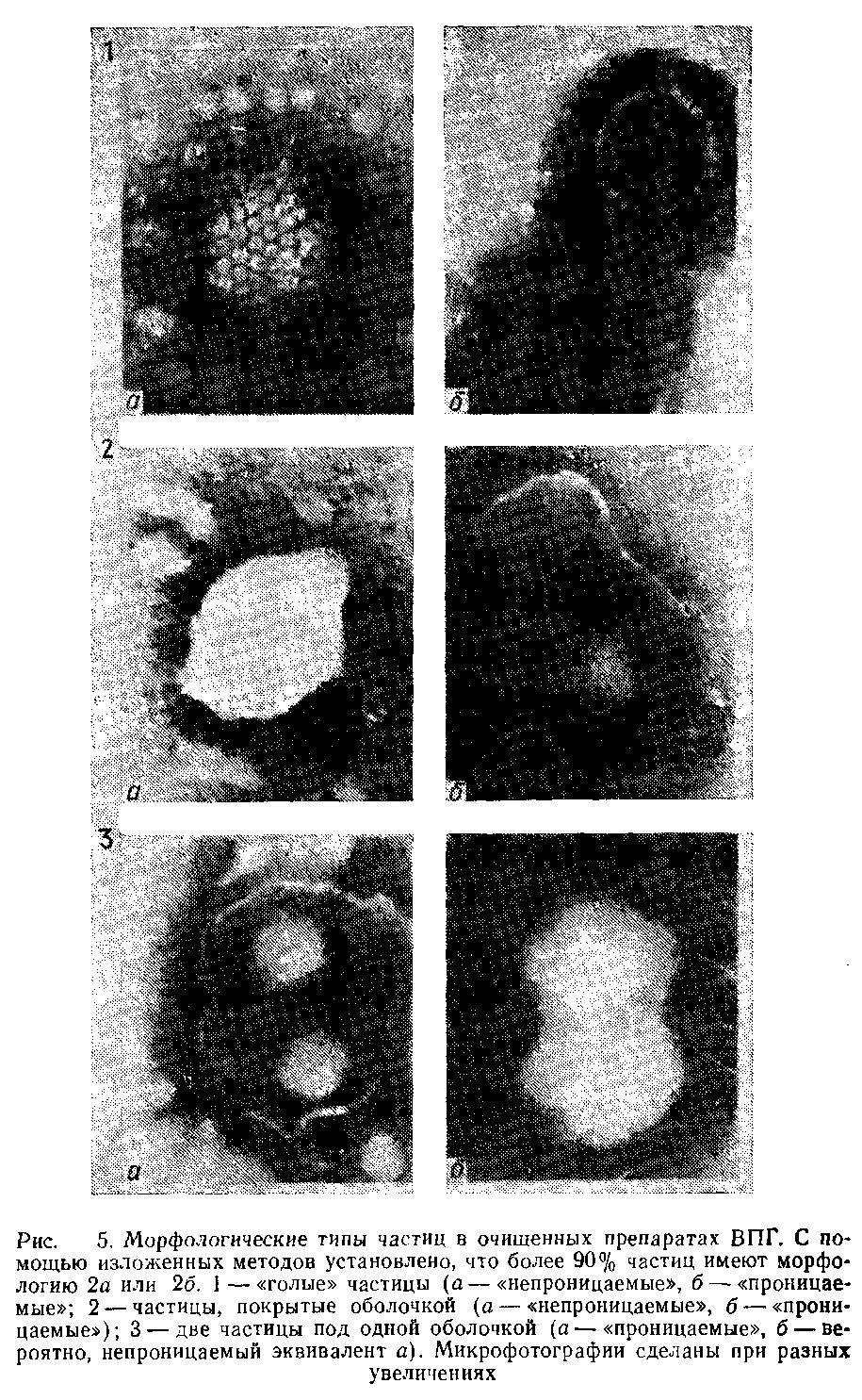 Подсчет частиц по методу "1 оор drop" предложен Ватсоном. Вирус разводят в воде или в растворе, содержащем 0,2 мг ВСА/мл в случае вирусных препаратов с концентрацией белка ниже 0,2 мг/мл, В любом случае вирус разводят до концентрации 109–1010 частиц/мл. Суспензию смешивают с равным объемом калибровочного материала. Мы рекомендуем использовать полистироловый латекс "DOW", содержащий -109 латексных частиц/мл. К полученной смеси добавляют 0,12 мл нейтрального 2%-ного раствора фосфовольфрамата натрия. Одну каплю полученного материала наносят, а затем высушивают на формваровых сетках с ячейками размером: 400 меш. Сетки просматривают под электронным микроскопом при увеличении 40 000. Частицы, видимые под микроскопом, классифицируют как "голые", "покрытые оболочкой" и "покрытые оболочкой". Эти частицы представлены на рис. 5. Непроницаемые, покрытые оболочкой частицы выглядят как плотные белые шарики, однако можно показать их способность количественно превращаться в проницаемые, покрытые оболочкой частицы. Как правило, для характеристики каждого образца вируса просчитывают пять групп из 20 латексных частиц.