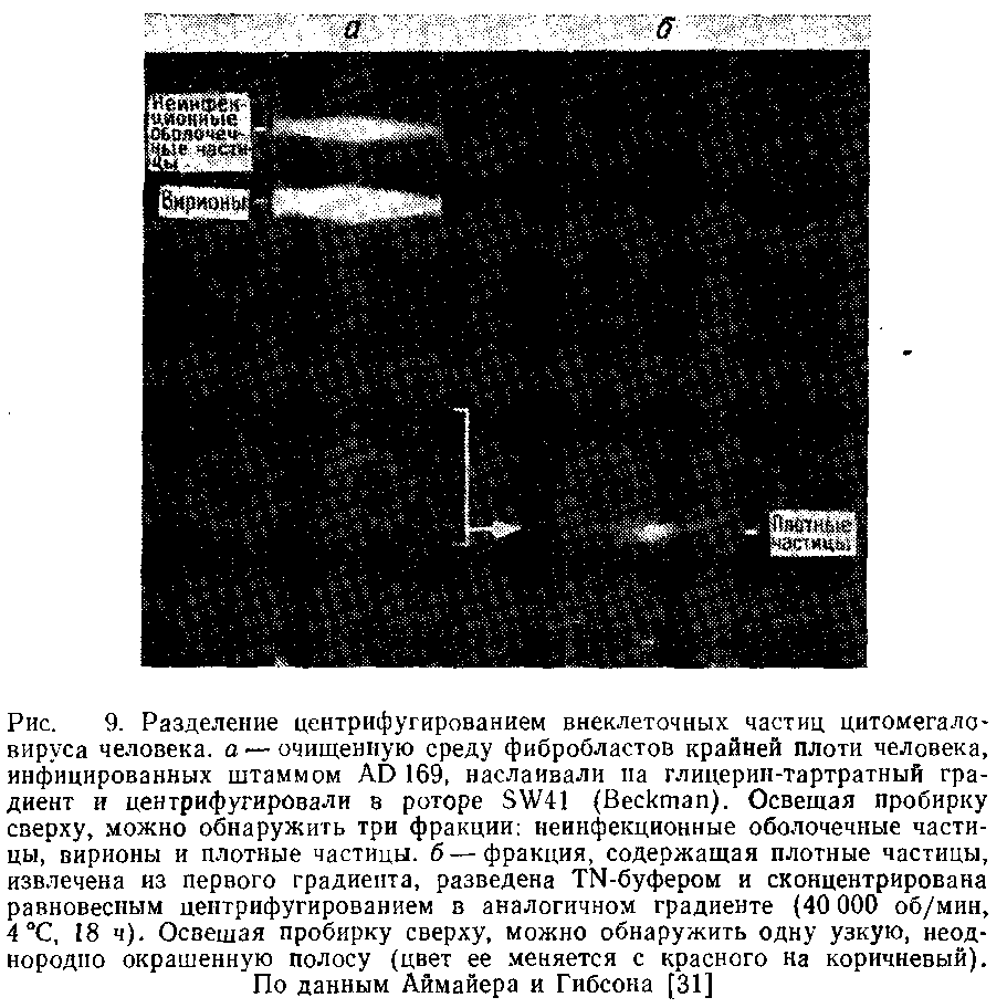 Эти вирусы дают на клетках ВНК высокие титры, которые легко определить суспензионным методом, предложенным Расселом. Для очистки вирусов клетки ВНК заражают с высокой множественностью инфекции и культивируют при 37°С 24 ч или 48 ч. На этой стадии вирусы могут быть очищены. Таким образом, получают качественные препараты оболочечных вирусов, белковый спектр которых представлен на рис. 7.