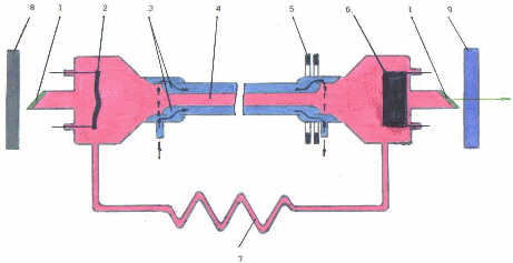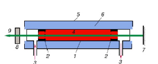 CO>2>-лазеры средней мощности (десятки – сотни ватт) конструируются отдельно в виде относительно длинных труб с продольным разрядом и продольной прокачкой газа. Типичная конструкция такого лазера показана на рисунке 2. Здесь 1 – разрядная трубка, 2 – кольцевые электроды, 3 – медленное обновление среды, 4 – разрядная плазма, 5 – внешняя трубка, 6 – охлаждающая проточная вода, 7,8 – резонатор.
