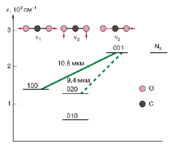 На рисунке 1 показаны нижние колебательные уровни основного электронного состояния вместе с условным представлением формы колебаний молекулы CO>2>.