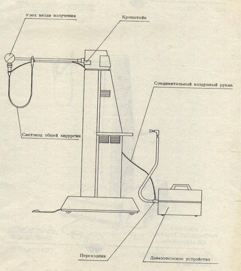 Основными элементами приставки являются: устройство ввода излучения и световод общей хирургии.