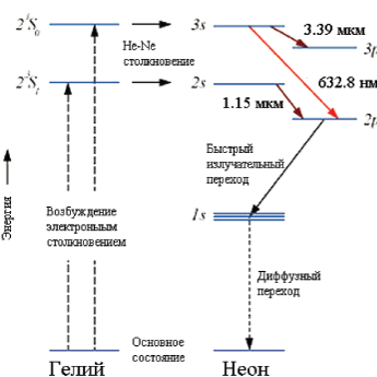 Цикл лазерной накачки CO>2>-лазера в стационарных условиях выглядит следующим образом. Электроны плазмы тлеющего разряда возбуждают молекулы азота, которые передают энергию возбуждения несимметричному валентному колебанию молекул CO>2>, обладающему большим временем жизни и являющемуся верхним лазерным уровнем. Нижним лазерным уровнем обычно является первый возбужденный уровень симметричного валентного колебания, сильно связанный резонансом Ферми с деформационным колебанием и поэтому быстро релаксирующий вместе с этим колебанием в столкновениях с гелием. Очевидно, что тот же канал релаксации эффективен в том случае, когда нижним лазерным уровнем является второй возбужденный уровень деформационной моды. Таким образом, CO>2>-лазер – это лазер на смеси углекислого газа, азота и гелия, где CO>2> обеспечивает излучение, N>2> – накачку верхнего уровня, а He – опустошение нижнего уровня.