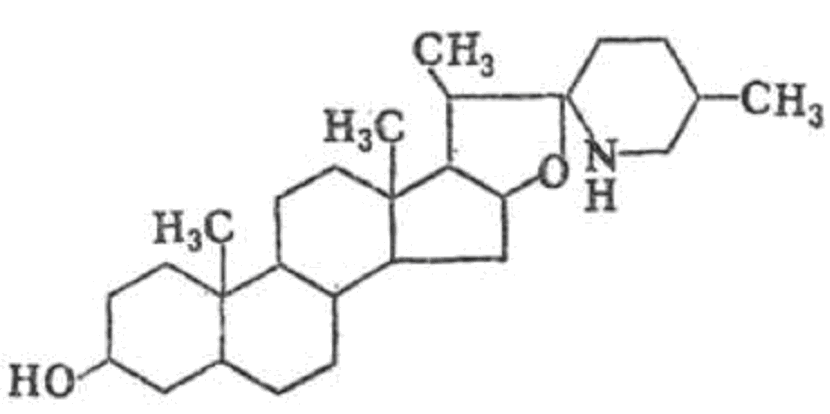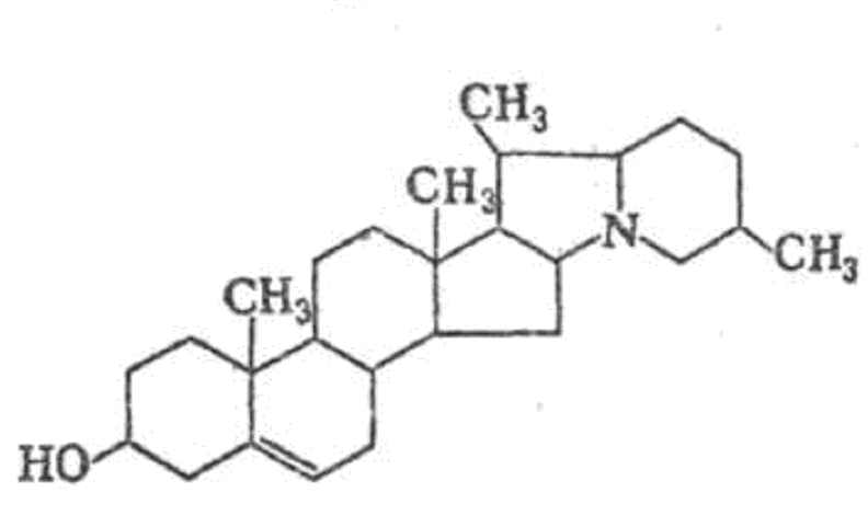 Стероидные алкалоиды представляют собой стероидные соединения, в которых сочетаются свойства как алкалоидов, так и стероидных сапонинов. Подобно сапонинам, гидролизуются на сахар и агликон, обладают поверхносной и гемолитической активностью. Стероидные алкалоиды - это гликозиды, в которых агликонами являются азотсодержащие стероидные соединения с 27 углеродными атомами, представляющие собой производные циклопентанпергидрофенантрена. По строению они аналоги стероидных сапонинов и отличаются от них содержанием в агликоне (сапогенине) атома азота в пятом или шестом (Е, F) кольце. Благодаря наличию атома азота в агликоне обладают основными свойствами. Стероидные алкалоиды широко распространены в растениях семейства пасленовых, у различных видов паслена, особенно дольчатого, содержащего стероидные гликоалкалоиды. Близкие стероидные гликоалкалоиды найдены в ботве картофеля, помидоров, баклажанов, красного перца, в паслене черном и паслене сладко-горьком. Эти травы при переработке могут дать агликон соласодин и другие стероиды, пригодные для синтеза кортизона. Стероидные алкалоиды характерны также для рода чемерицы. Стероидные алкалоиды, подобно стероидным сапонинам, обладают поверхностно-активными и гемолитическими свойствами и образуют молекулярные соединения с холестерином и близкими стеринами.
