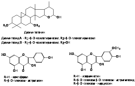 К группе даммарана относятся сапонины женьшеня (панаксозиды), а к группе циклоартрана – астрагала шерстистоцветкового (дазиантогенин).