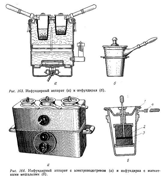 В аптечных условиях приготовление водных вытяжек производят в специальных инфундирных аппаратах. Эти аппараты устроены в виде водяных бань с электрическим или другим подогревом и бывают различной конструкции. Они имеют специальной формы сосуды (инфундирки), в которых происходит извлечение экстрагентов растительного материала. Выпускаются инфундирки различной емкости и из различного материала. Скорость нагревания жидкости в инфундирке зависит от материала из которого она изготовлена. Например, фарфоровые инфундирки менее теплопроводны, чем металлические, и поэтому экстрагент в них нагревается медленнее. При использовании фарфоровой инфундирки ее необходимо, еще до внесения растительного сырья, подогреть в течение 15 минут на кипящей водяной бане.