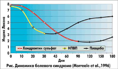 В большинстве клинических исследований, в которых сравнивался эффект хондроитин сульфата и НПВП отмечалось, что хондроитин сульфат в дозе 1200 мг/сут так же эффективен, как диклофенак и ибупрофен в терапевтических дозах, и более эффективен, чем плацебо в отношении уменьшения боли и увеличения подвижности суставов у больных остеоартрозом. Хотя эффект хондроитин сульфата наступал несколько позже (на 6-8-й неделе лечения) по сравнению с действием НПВП (на 1-2-й неделе лечения), он держался более длительно после прекращения лечения (см. рис.).