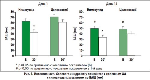 В последний день лечения у всех пациентов перед приемом препаратов оценивали интенсивность болевого синдрома по ВАШ. В обеих группах исследования интенсивность боли была ниже, чем до начала лечения. Такие результаты наблюдали и у пациентов с синовиальным выпотом, и без выпота (рис. 1 и 2). Через 30 мин после приема препаратов интенсивность боли в группе нимесулида была достоверно ниже, чем до приема лекарства, тогда как статистически достоверной разницы в группе целекоксиба не обнаружено. Также уменьшение между аналогичными показателями болевого синдрома было достоверно выше в группе нимесулида (рис. 2).(7)