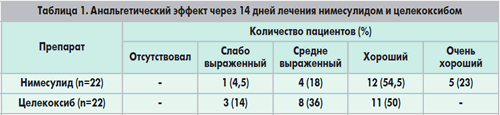 На сегодняшний день в клинической практике в Украине используется несколько десятков (30) разных по производителю и фармацевтическим формам препаратов нимесулида. Накоплен позитивный опыт фармакотерапии этим препаратом, причем в разных фармацевтических формах при остеоартрозе (В.Н. Коваленко. Н.М. Шуба, А.К. Галицкая, 2001). Достаточно высокую эффективность выявили исследования растворимой формы нимесулида – препарата Нимесил. Следует отметить, что благодаря своим фармацевтическим и фармакокинетическим свойствам данной фармацевтической формы нимесулид сравнительно с другими НППВ, диклофенаком натрия, например, проявляет более ранний обезболивающий эффект уже после первого приема. Использование 100 мг нимесулида провоцирует более выраженный и быстрый терапевтический эффект, чем 200 мг целекоксиба или 25 мг рофекоксиба на протяжении 3-х часов. У больных с остеоартрозом обезболивание происходит через 15 минут после приёма нимесулида, тогда как эффект целекоксиба и рофекоксиба развивается намного медленнее. Лечение нимесулидом гораздо дешевле, чем использование упомянутых выше препаратов со схожими фармакотерапевтическими препаратами. (8).