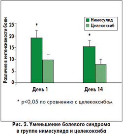 У пациентов с синовиальным выпотом анальгетический эффект нимесулида был более выраженным, чем целекоксиба. В группе пациентов, получавших нимесулид, показатели по ВАШ через 30 мин после приема лекарства были достоверно ниже, чем до приема препарата (рис. 1), тогда как в группе целекоксиба эта разница не была статистически значимой. Болевой синдром в группе нимесулида уменьшался значительно больше, чем в группе целекоксиба (рис. 2). С другой стороны, эффективность лечения обоими препаратами была сравнимой у пациентов без синовиального выпота.