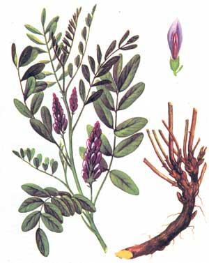 Стебло голе, прямостояче, просте, іноді гіллясте, опушене, висотою до 120 см. Листки чергові, непарноперистоскладені, ланцетоподібні, на верхівці округлі або загострені, зверху голі, знизу опушені. Квітки двостатеві, неправильні, з білувато-фіолетовим віночком. Плід - видовжений біб, прямий або злегка зігнутий, не розкривається, 2 – 6 - насіннєвий.