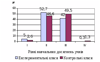 Детальний аналіз рівня навчальних досягнень учнів показав тенденцію зменшення кількості учнів з низьким і середнім рівнем і зростання кількості учнів з достатнім та високим рівнем навчальних досягнень в експериментальних класах.